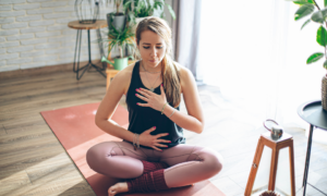 - Begin by placing one hand on your chest and one hand on your belly. And when you’re ready you can close your eyes and just start to notice your breath going in and out and don’t try to change it at all just be aware of it.