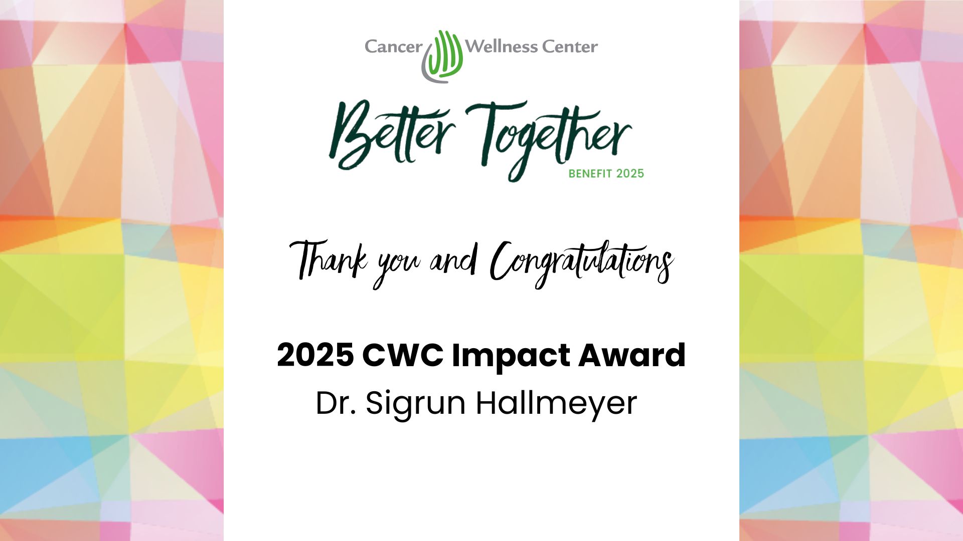 The Better Together Benefit continues to be our largest fundraising event, bringing together our community for an evening of support, awareness, and fun. At the event, the Center will presents the CWC Impact Award, honoring an individual whose leadership in the community has helped improve the lives of people affected by cancer.