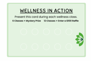 Attendees will receive a punch card to track their sessions. After 6 sessions, participants earn a wellness-themed item; after 12 sessions, they’re entered into a raffle for a $100 gift card!